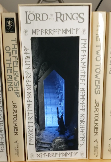 My complaints about the prior design are documented here. This update is now similar to this nook on YouTube ("How to Build a Mines of Moria Infinity Box Book Nook"), but you will note that the design without the terrain in front means the effect is very poorly behaved in daytime and the glamour shots are all in the dark. This new model takes the best aspects of both designs.
